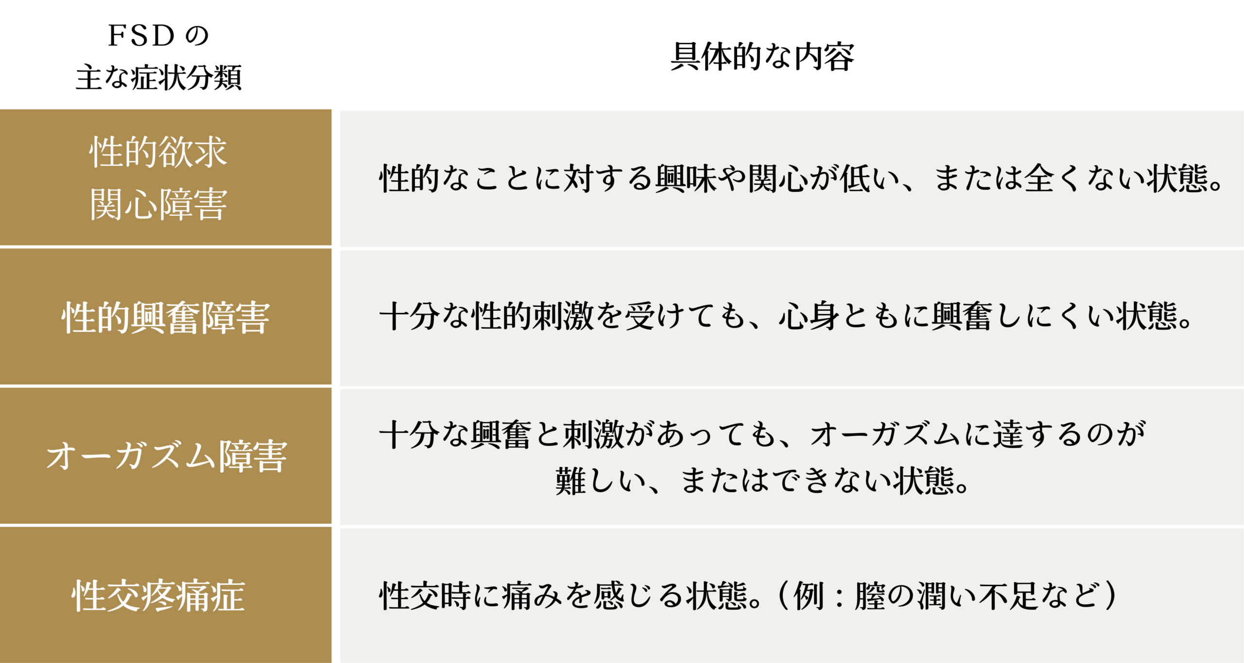 かつて、女性が性的な快感を得られない状態を「不感症」と呼ぶことがありました。しかし、この言葉は誤解を招きやすく、個人の尊厳を傷つける可能性があるため、現代の医学ではほとんど使われません。その代わりに用いられるのが、「女性性機能障害(Female Sexual Dysfunction: FSD)」という医学的な診断名です。これは、性に関する様々なトラブルの総称であり、病気というよりは「機能のトラブル」と捉えられています。具体的には、以下の症状が6ヶ月以上続き、ご本人がそれを苦痛に感じている場合に診断されることがあります。