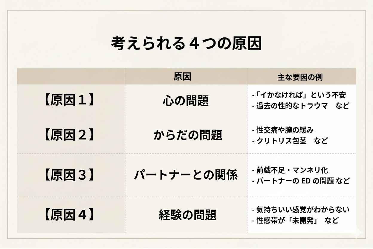 中イキできない原因は、決して一つではありません。心の問題、体の問題、パートナーとの関係、そして経験など、様々な要因が複雑に絡み合って影響しています。ご自身の状況を振り返りながら、どの要因が当てはまるか考えてみましょう。