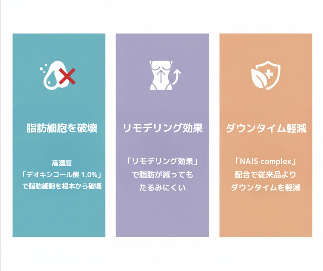 「効果が強い分、腫れや痛みもひどいのでは?」と不安に思うのは当然です。FatX Coreはその点にも配慮されています。抗炎症作用を持つ植物由来成分などを組み合わせた「NAIS complex」という独自の成分が配合されています 。このNAIS complexが、デオキシコール酸による炎症反応を和らげる働きをします。そのため、強力な脂肪溶解効果を維持しつつも、従来のFatXと比較して腫れや痛みを半分程度に抑えることに成功したと報告されています 。効果とダウンタイムのバランスが大きく改善されている点も、FatX Coreが選ばれる理由の一つです。