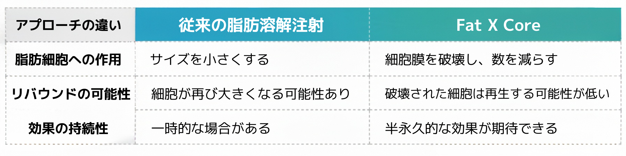 - FatX Coreは高濃度デオキシコール酸により脂肪細胞の数を減らすため、リバウンドしにくい