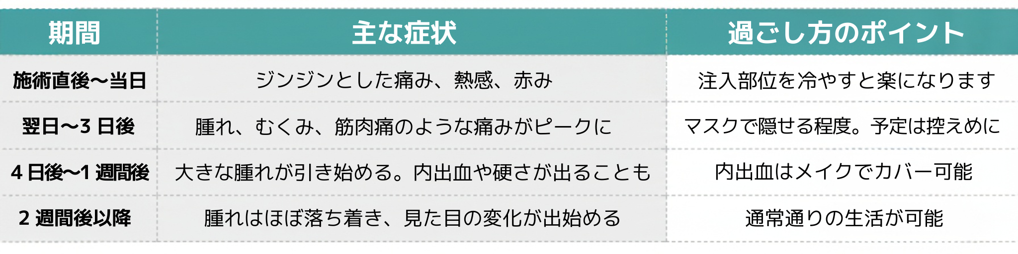 施術の翌日から3日後あたりが、腫れ、むくみ、そして筋肉痛のような痛みのピークとなることが一般的です。特に顔の施術後は、普段より一回り顔が大きく見えることもあります。しかし、多くの場合、マスクをすれば十分に隠せる範囲ですので、日常生活に大きな支障はありません。