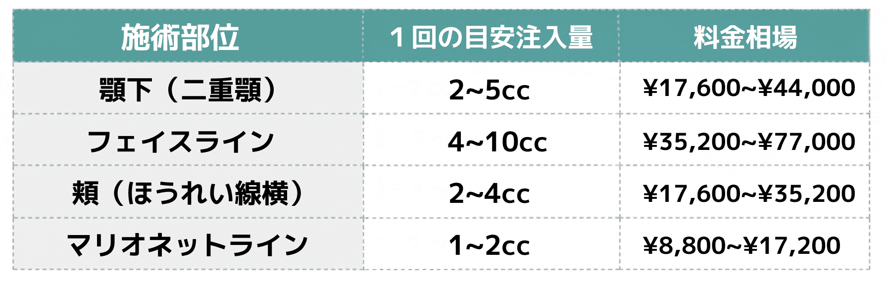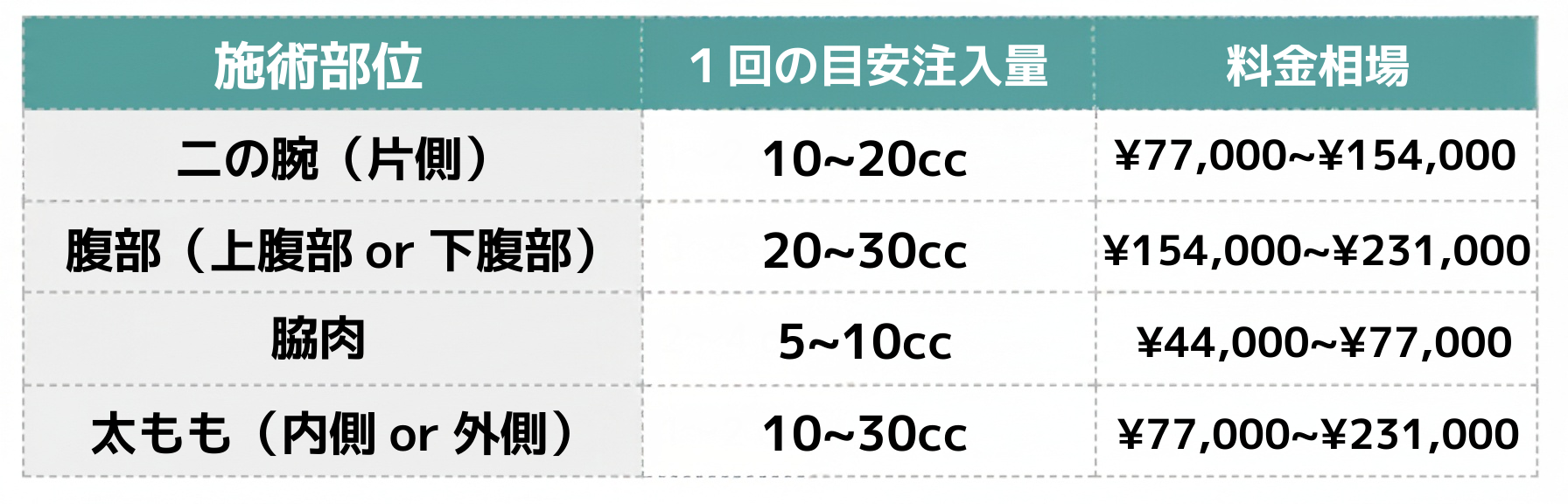 ご自身の悩みの部位に、どれくらいの注入量と費用がかかるのかは非常に重要です。ここでは、人気の部位ごとに必要な注入量(cc)と料金の目安をまとめました。ただし、これらはあくまで一般的な目安であり、実際の量は医師の診察によって決定されます。